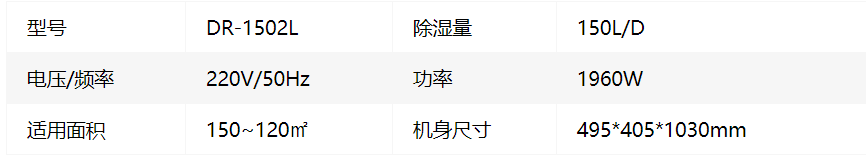 多乐信DR-1502L 商业除湿机 除湿量 150L/D 电压/频率 220V/50Hz 功率 1960W 适用面积 150~120㎡ 机身尺寸 495*405*1030mm